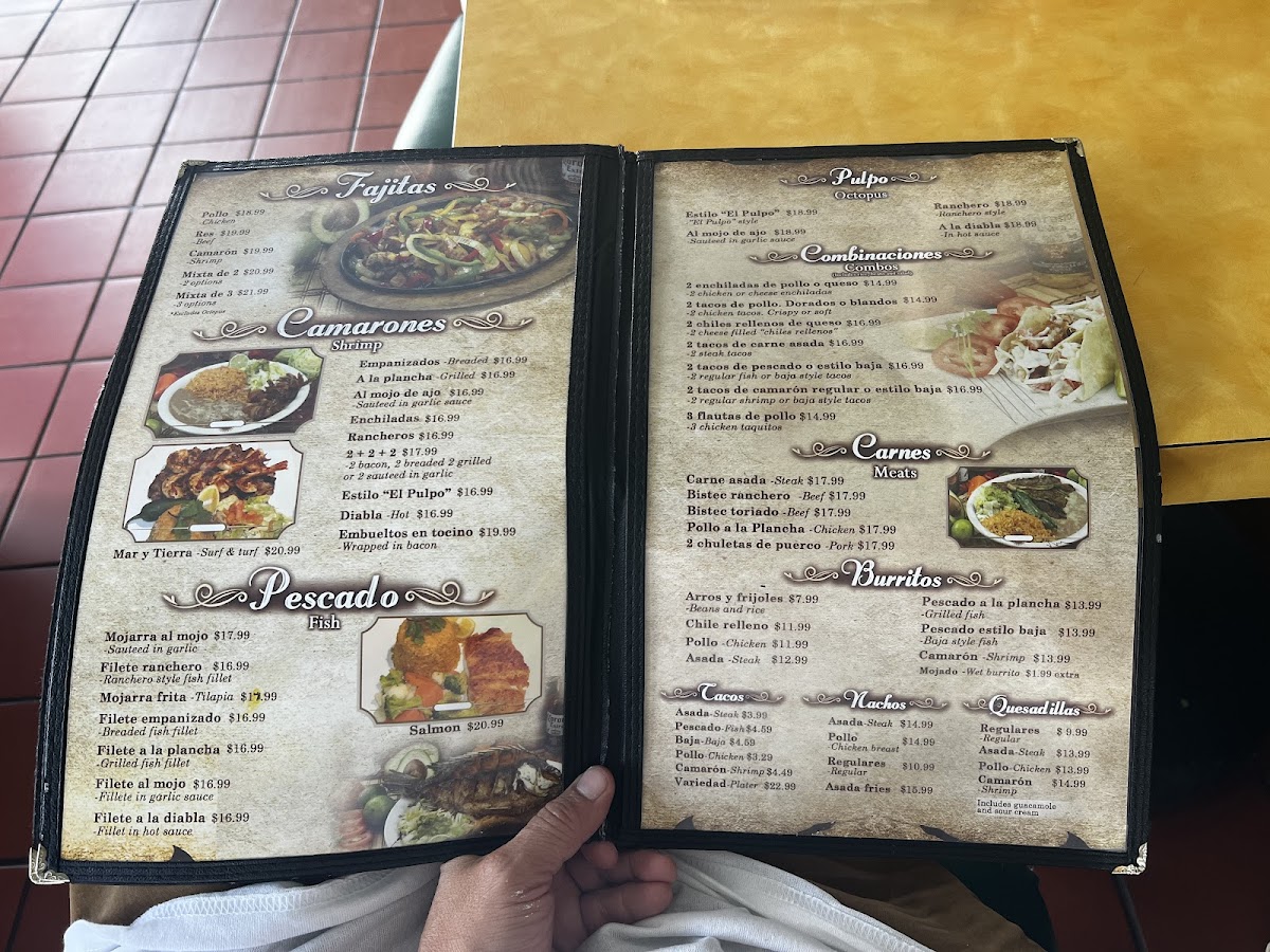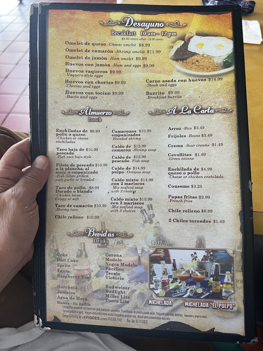 From a reviewer’s perspective, the menu at Mariscos El Pulpo offers a concise yet satisfying snapshot of traditional Mexican comfort food with a clear emphasis on seafood and hearty classics. The breakfast section (Desayuno) sets a welcoming tone with options like Omelet De Queso, Omelet De Camarón, and Omelet De Jamón, each catering to different tastes, whether you prefer something simple, savory, or infused with seafood flavors. Classics such as Huevos Con Jamón and Huevos Vaqueros further reinforce the idea that this is a place where mornings are meant to be filling and flavorful. Moving into the lunch and à la carte selections (Almuerzo, Lunch, A La Carta), the menu continues its straightforward appeal with staples like Taco De Camarón and Chile Relleno, dishes that highlight the restaurant’s strength in balancing traditional recipes with bold, familiar flavors. Sides such as Arroz, Frijoles, and Crema complement the main dishes well, allowing diners to round out their meal exactly to their liking. To complete the experience, the beverage selection remains simple and refreshing, featuring choices like Coke, Diet Coke, Sprite, Horchata, and Jamaica, which pair nicely with both breakfast and lunch items. Overall, the menu at Mariscos El Pulpo feels thoughtfully curated rather than overwhelming, focusing on recognizable dishes done right. As a conclusion to the dining experience, it leaves the impression of a neighborhood restaurant that values consistency, comfort, and authentic flavors, making it an appealing stop for anyone craving a satisfying Mexican meal in Oxnard.